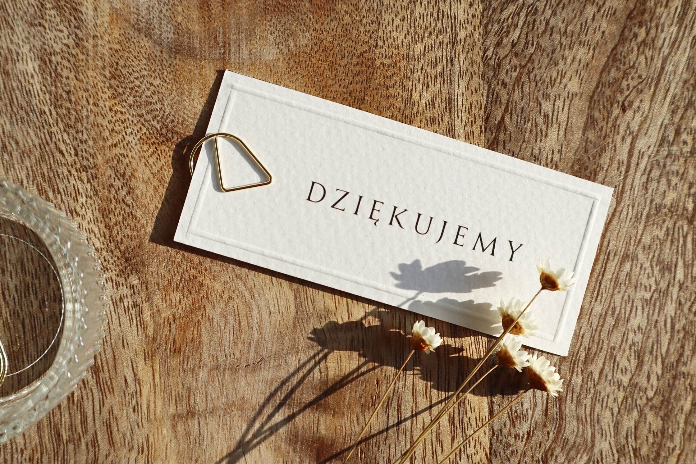 Bileciki z podziękowaniem stanowią miły akcent na pożegnanie gości lub ciekawy dodatek do upominku na talerzu weselnym. Każdy z bilecików drukujemy na fakturowanym papierze premium o gramaturze 300g i wymiarach 40x90mm. Istnieje możliwość dokupienia do bilecików dodatkowych wstążek.