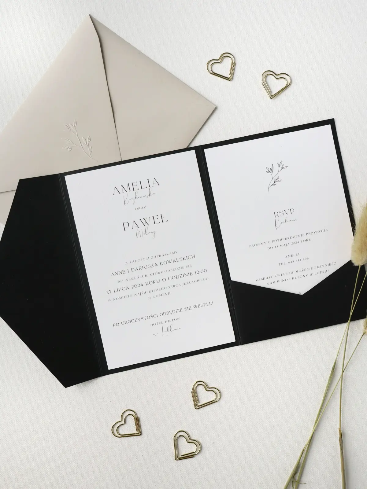 Kartka z zaproszeniem, RSVP, czarna koperta składana, złoty spinacz w kształcie serca i szaro-beżowa koperta z tłoczeniem i nadrukiem danymi gości na odwrocie.