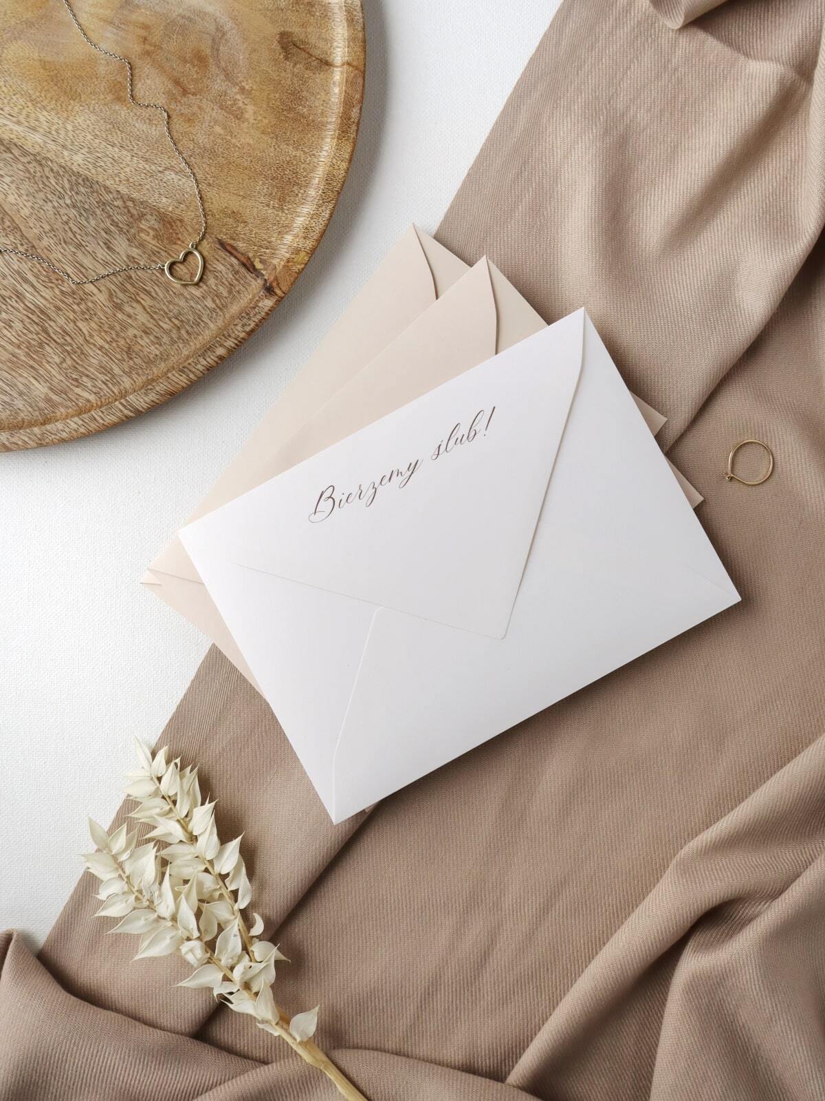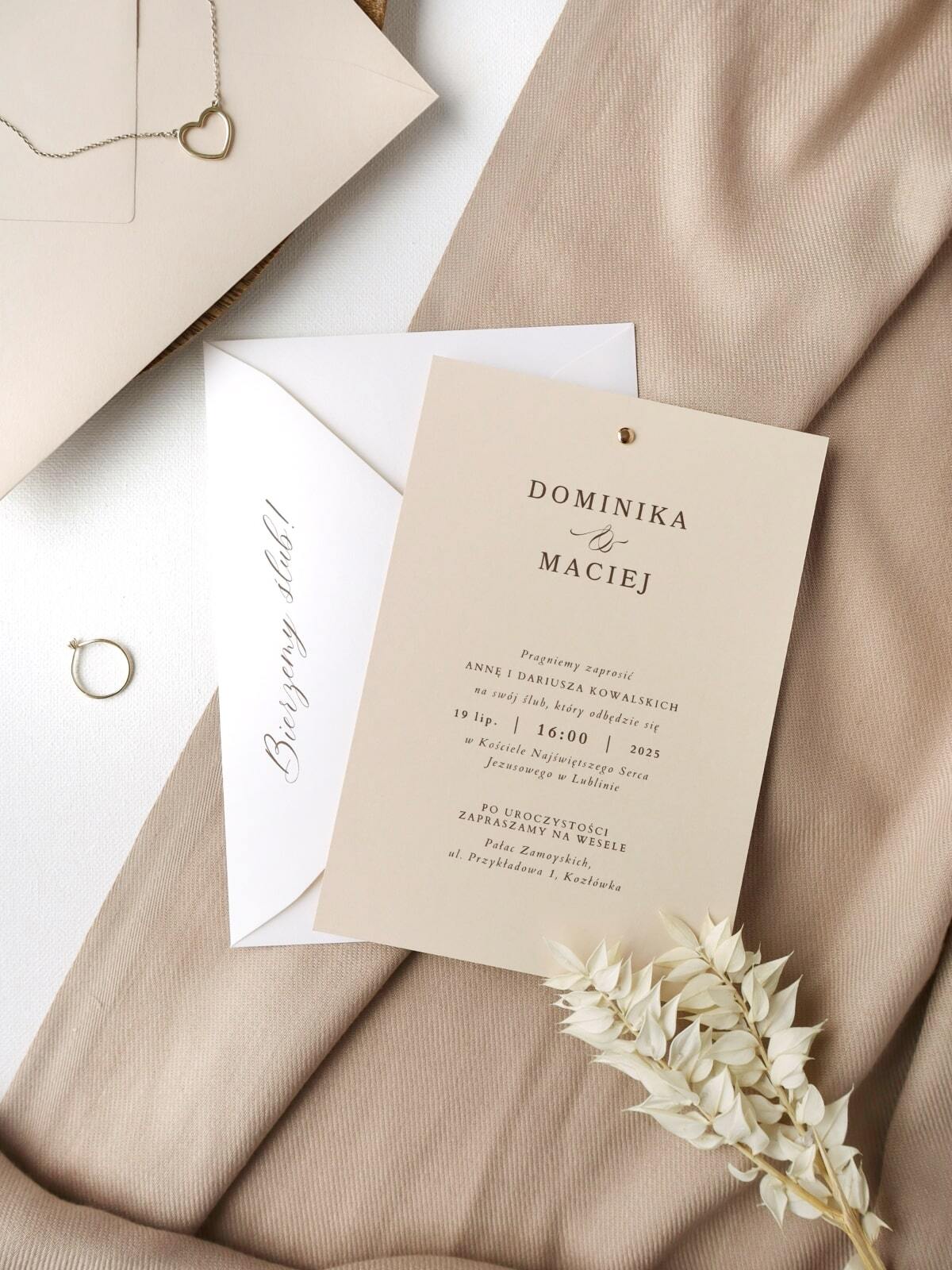 Karta zaproszenia w kolorze złamanej bieli i beżowa karta RSVP, sczepione złotym nitem. Do tego koperta z nadrukiem na klapie i odwrocie koperty.
