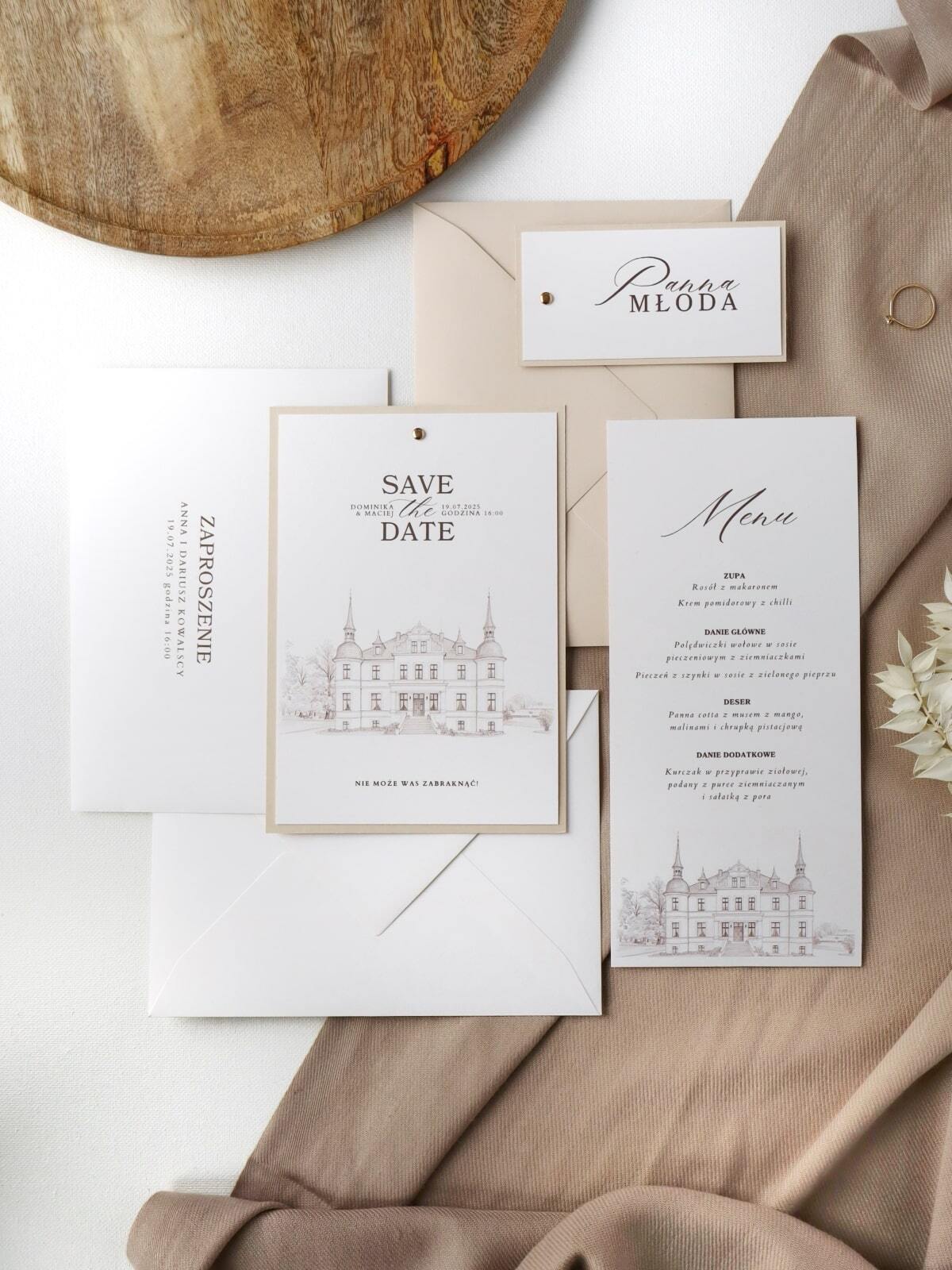 Wierzchnią kartę zaproszenia z nadrukiem budynku drukujemy na śmietankowym fakturowanym papierze o gramaturze 300g. Karta RSVP jest wykonana z beżowego papieru o tej samej fakturze i gramaturze. Całość spięta jest złotym nitem. Całość pakujemy w kopertę w rozmiarze B6 w odcieniu śmietankowej kartki, z nadrukiem imion i nazwisk gości.