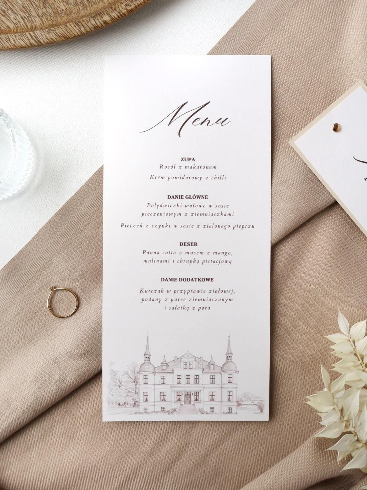 Kartka menu weselnego wydrukowana na fakturowanym śmietankowym papierze o gramaturze 300g z personalizowanym nadrukiem budynku. Wymiary - 99x210mm.