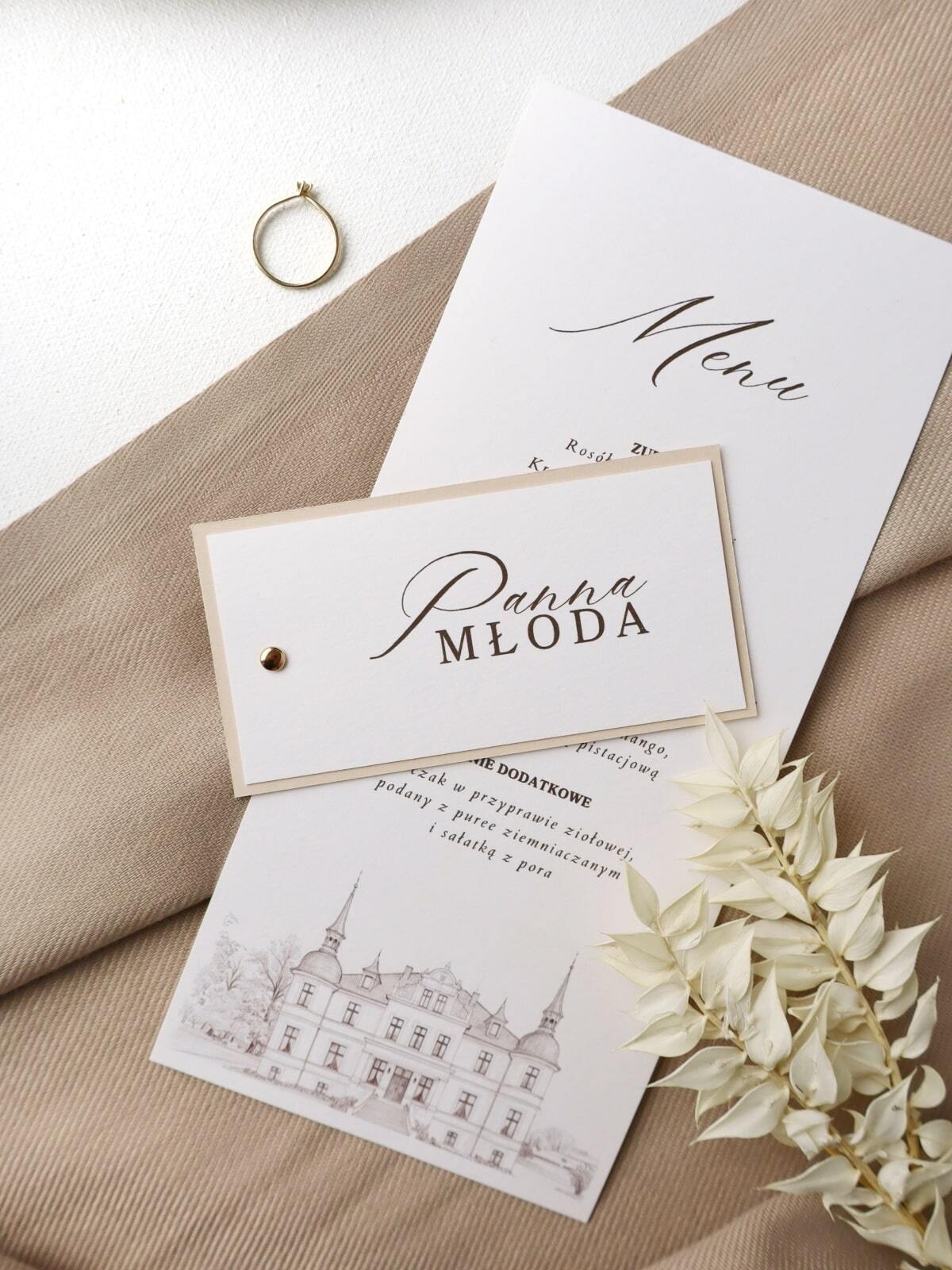 Minimalistyczna winietka weselna do położenia na stole lub talerzu gości. Wydrukowana na śmietankowym papierze o gramaturze 300g. Pod spodem beżowa kartka o tej samej gramaturze. Całość spięta jest złotym nitem.