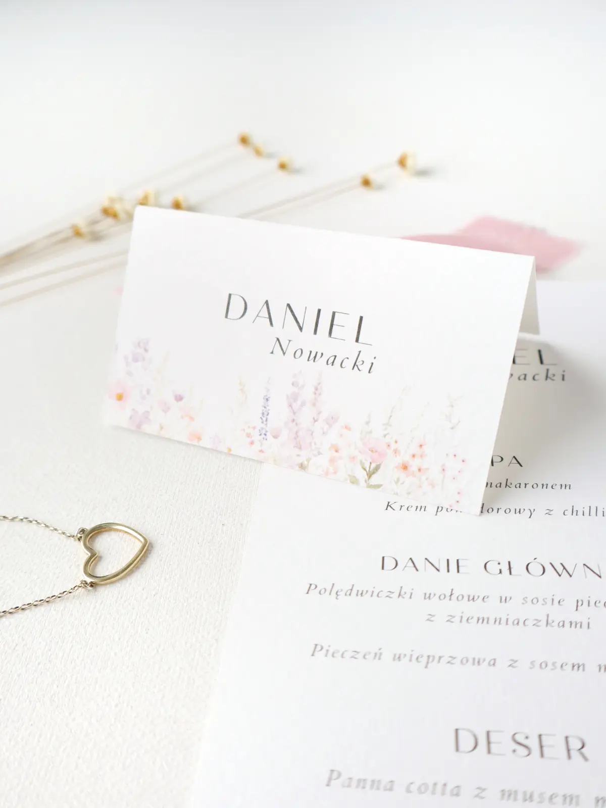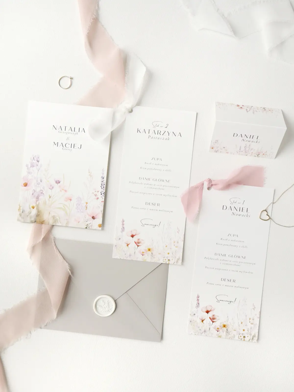 Ta papeteria ślubna to subtelne detale: delikatne różowe tony, miękkie kwiatowe akwarele i eleganckie dodatki. Piękna, harmonijna całość i odrobina ciepła, naturalności oraz spokoju na ślubie i weselu.
