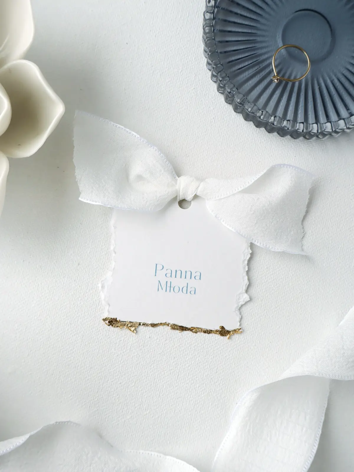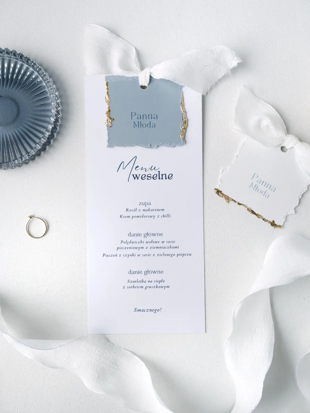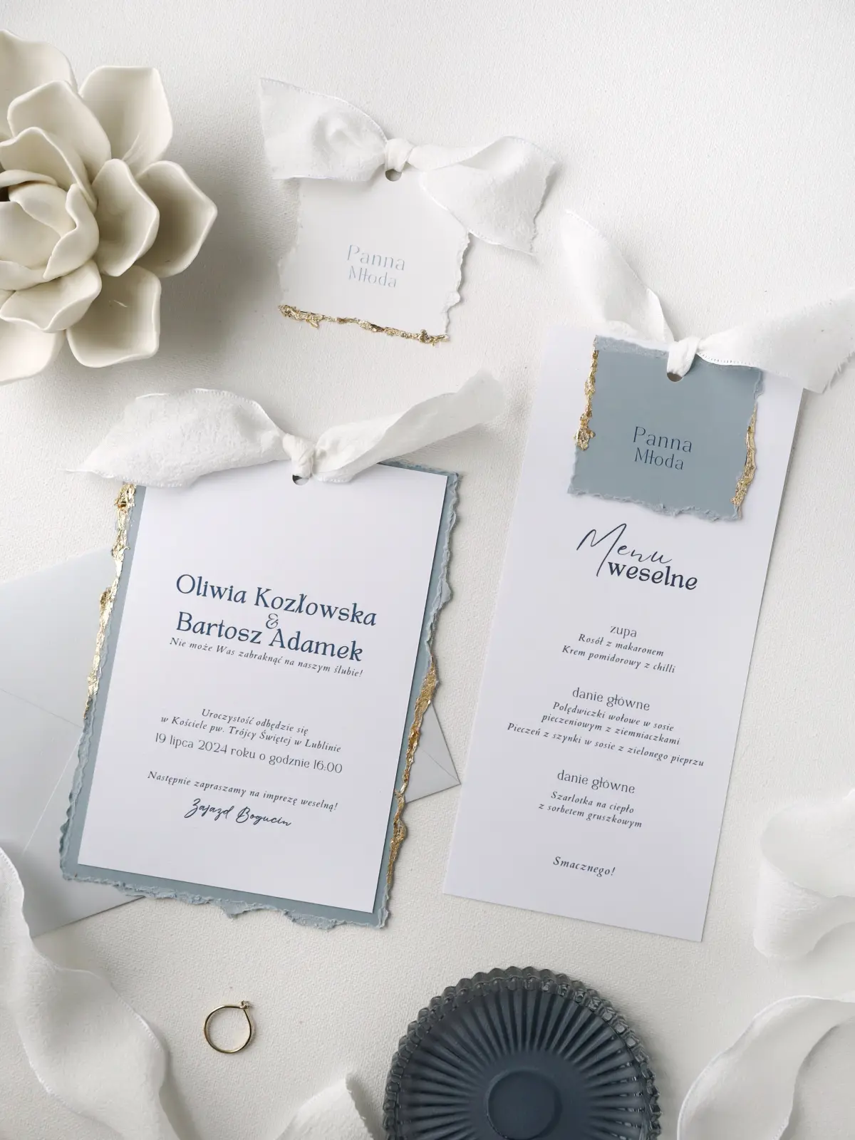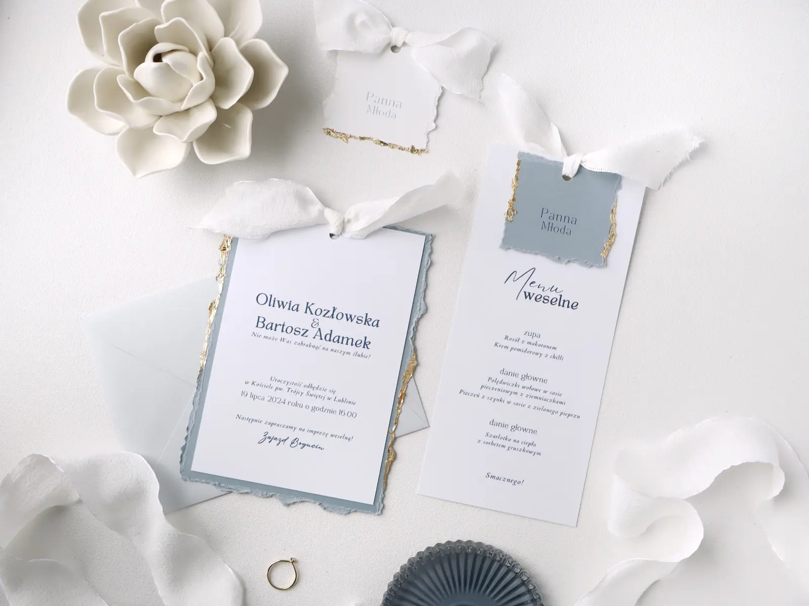 Połączenie bieli i dusty blue, wzbogacone o strzępione boki, złocenia i białą wstążkę, to mała, piękna kropka nad „i”, która od razu wprowadza na weselny stół romantyczny vibe.