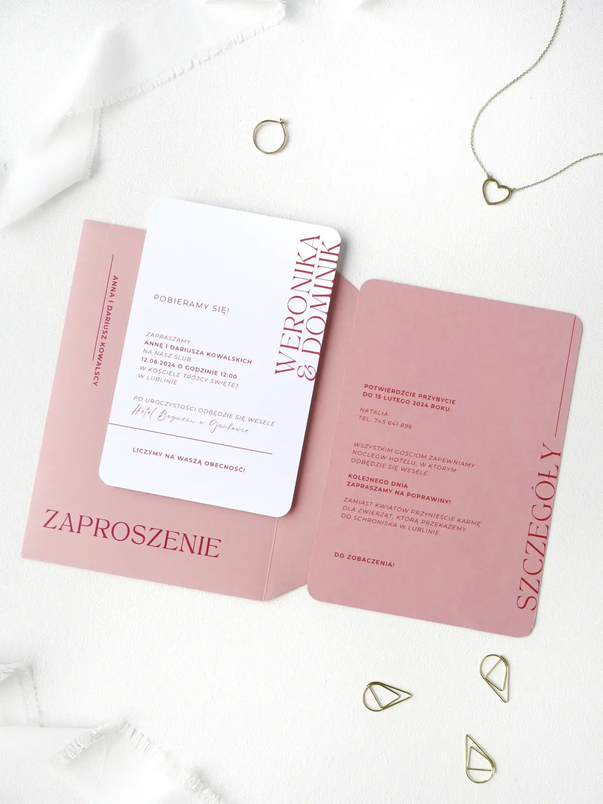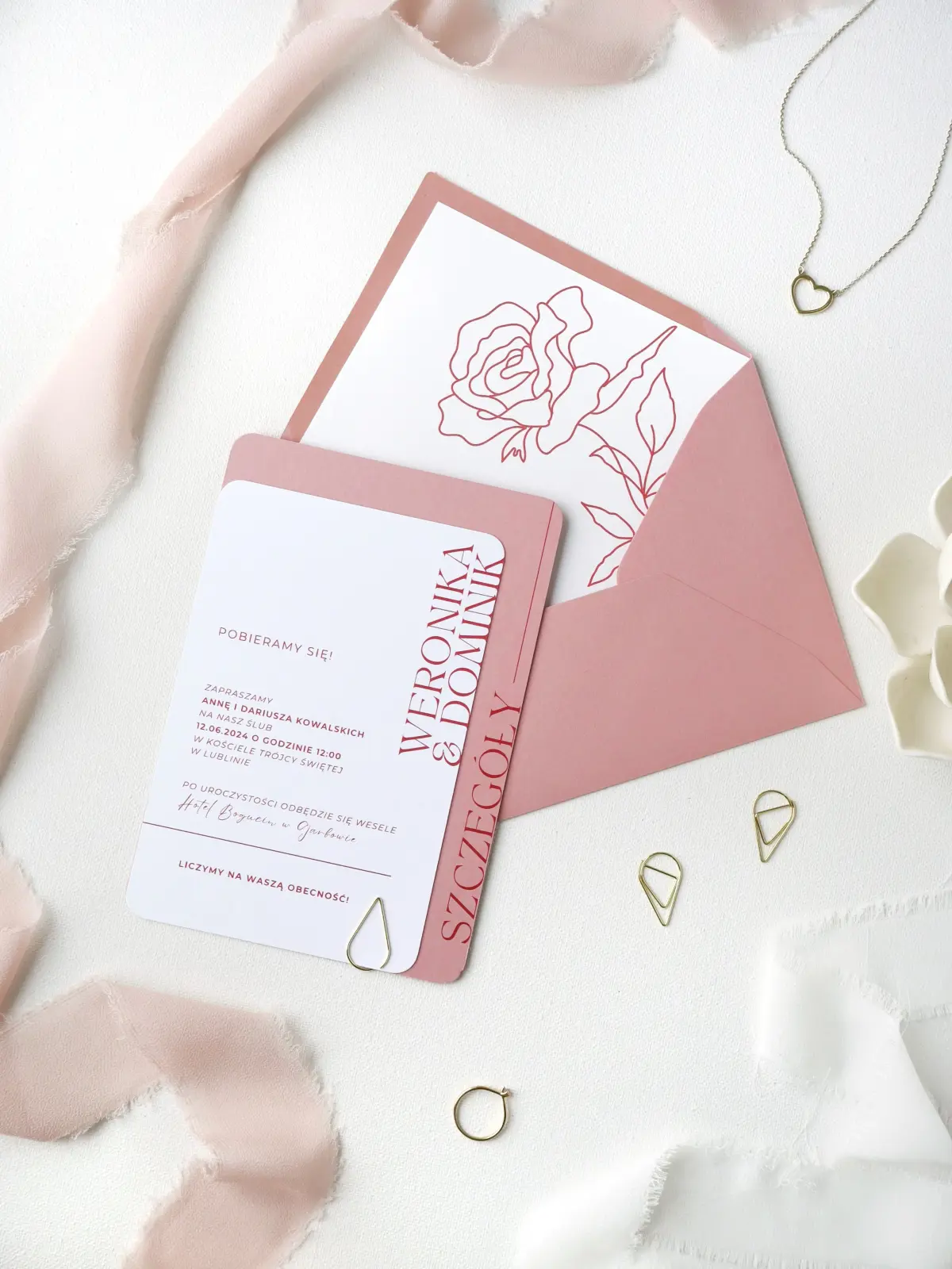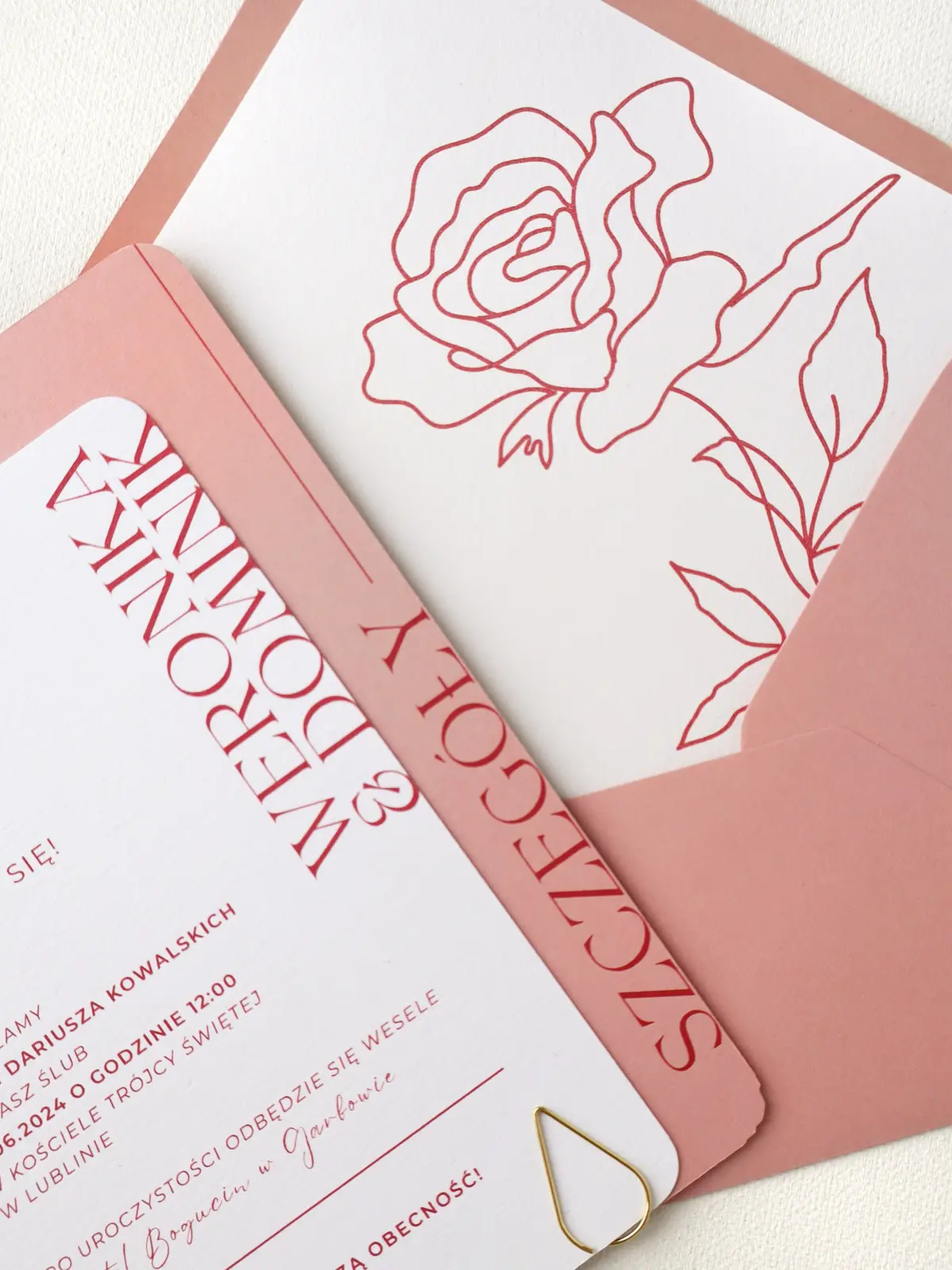 Biała karta z zaproszeniem, różowe RSVP, złoty spinacz, koperta z nadrukiem i wklejką z różą.