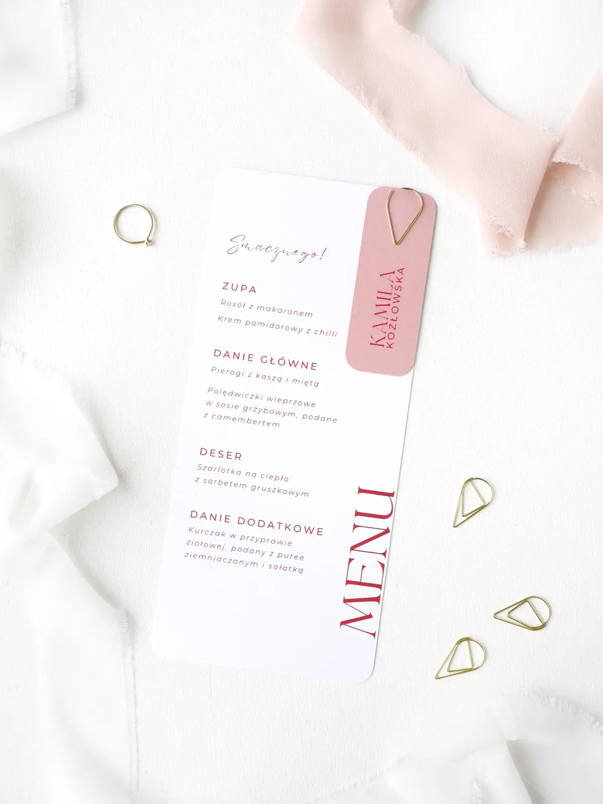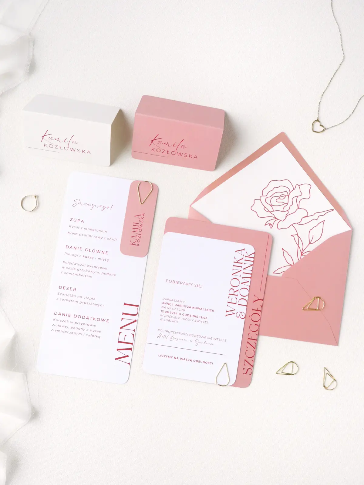 Menu i winietki w odcieniach brudnego różu i ciepłej bieli tworzą delikatne połączenie estetyki i spokoju, który można poczuć przy każdym spojrzeniu. Zaokrąglone formy i złote akcenty tworzą harmonijną całość. Razem przepięknie dopełniają charakter przyjęcia.