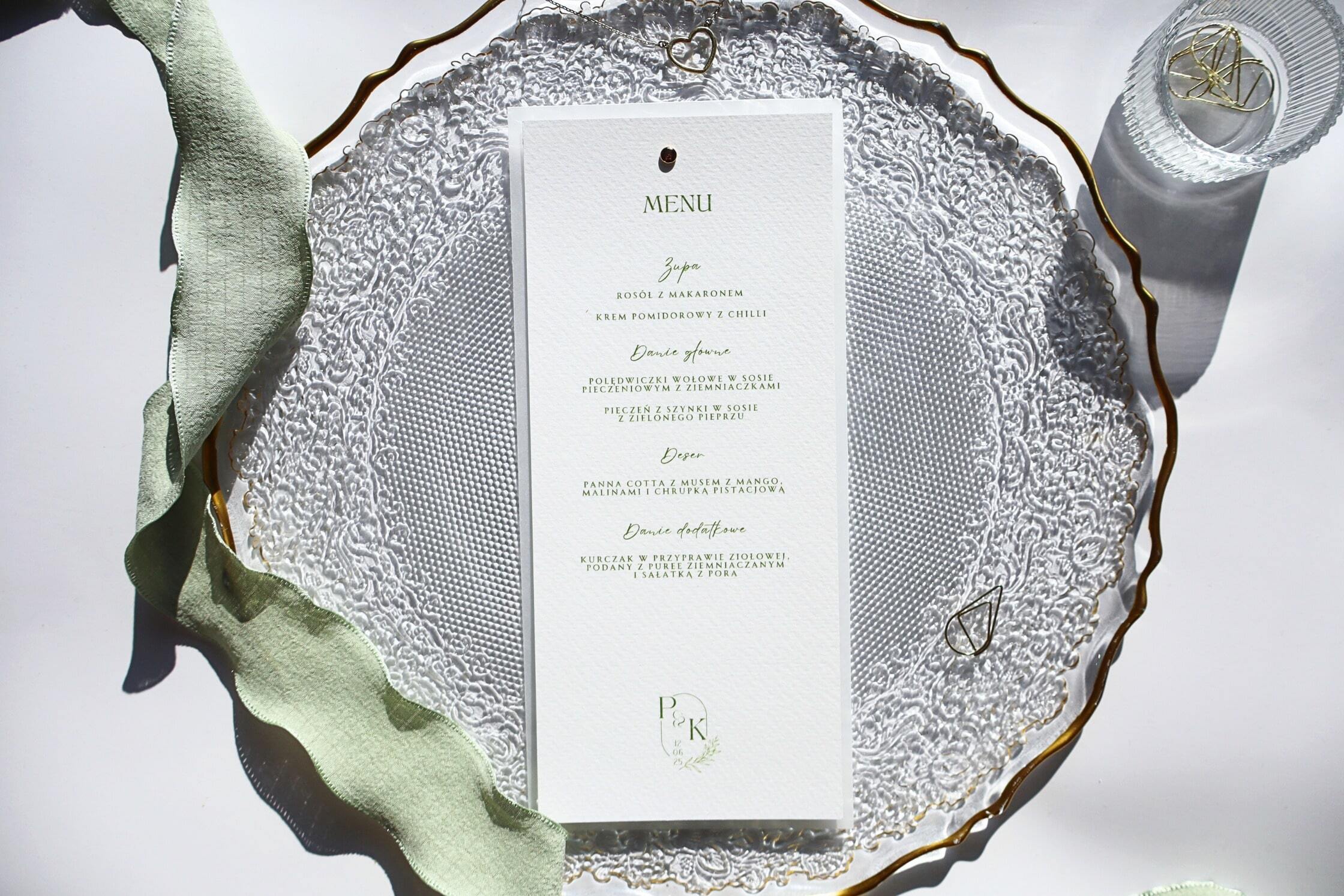 Kartę menu z tej kolekcji drukujemy na fakturowanym papierze premium w odcieniu delikatnej śmietanki o gramaturze 300g (rozmiar 99x210mm). Pod spodem znajduje się podkładka z papieru transparentnego, a całość spięta jest złotym nitem. Na dole każdego menu nadrukowujemy inicjały Pary Młodej wraz z datą wesela.