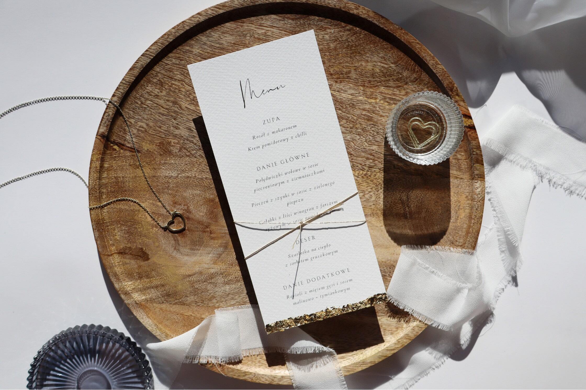 Kartę menu z tej kolekcji drukujemy na fakturowanym papierze premium w odcieniu delikatnej śmietanki o gramaturze 300g (rozmiar 99x210mm). Kartka jest ręcznie pozłacana i przewiązana złotą nicią.