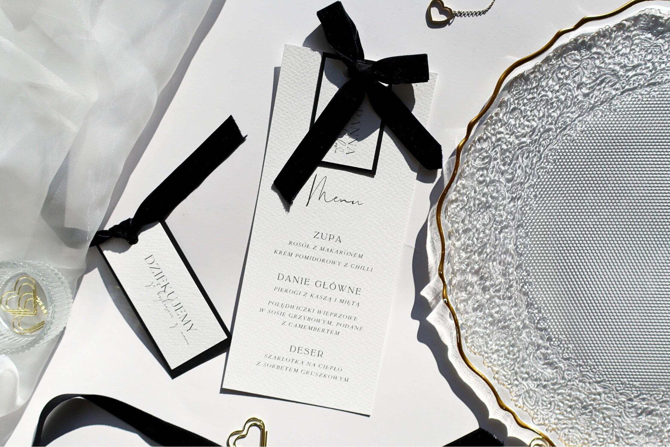 Menu weselne z personalizowaną winietką. Kartę menu z tej kolekcji drukujemy na fakturowanym papierze premium w odcieniu delikatnej śmietanki o gramaturze 300g (rozmiar 99x210mm). W zestawie personalizowana winietka, przewiązana czarną welurową wstążką.