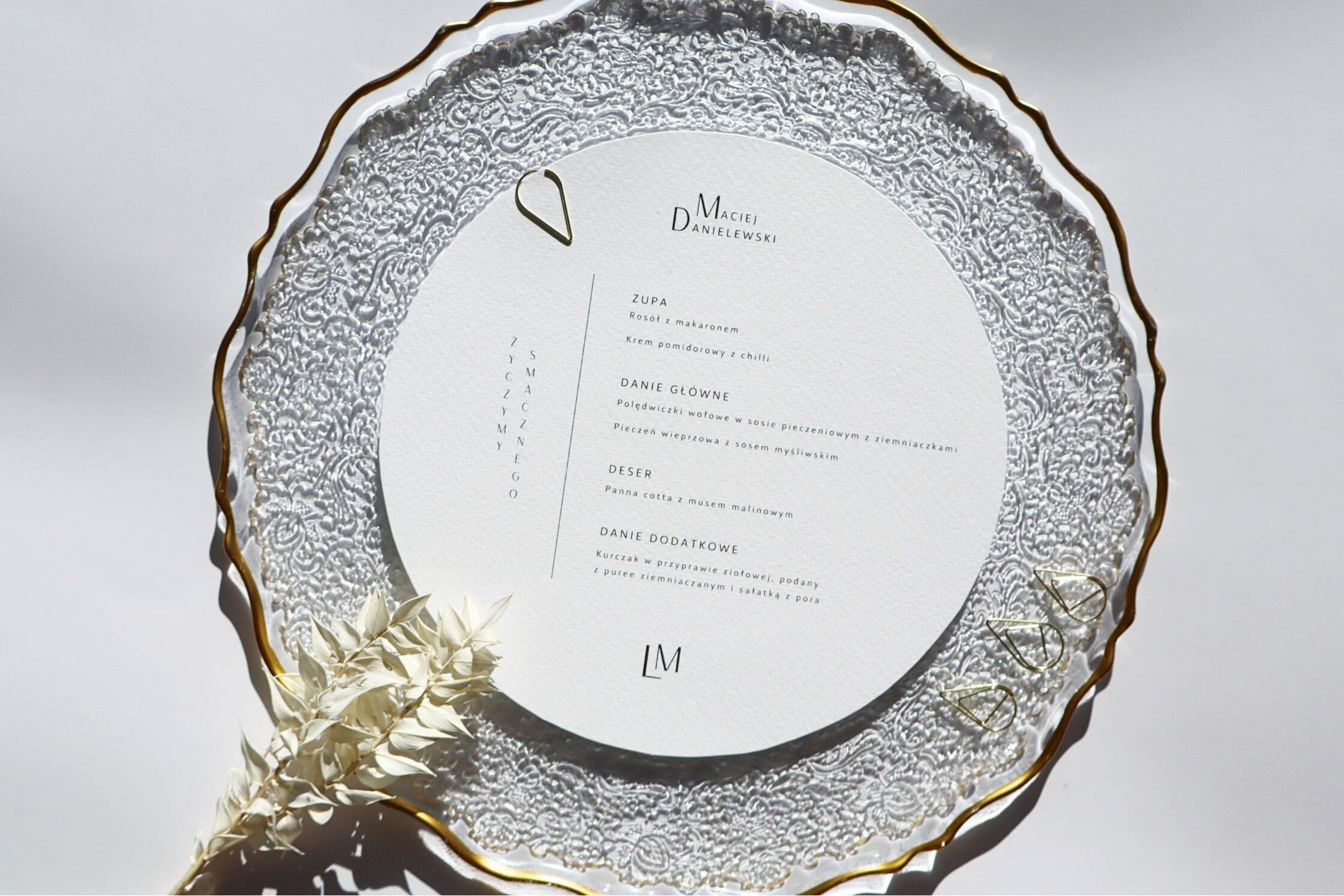 Leżące menu weselne wydrukowane na fakturowanym papierze premium w odcieniu delikatnej śmietanki o gramaturze 300g (średnica 190mm). Dopełnieniem produktu jest delikatny złoty spinacz, wpięty z lewej strony menu.