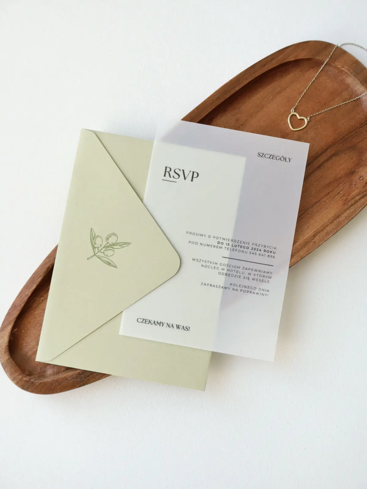 Biała karta zaproszenia, przezroczysta karta RSVP na papierze transparentnym i jasnozielona koperta z ilustracjami oliwek - razem tworzą spójną, pełną elegancji kompozycję. To delikatne zaproszenie ślubne, które od pierwszego kontaktu wprowadza w atmosferę letniego słońca, włoskiej radości i subtelnego luksusu.