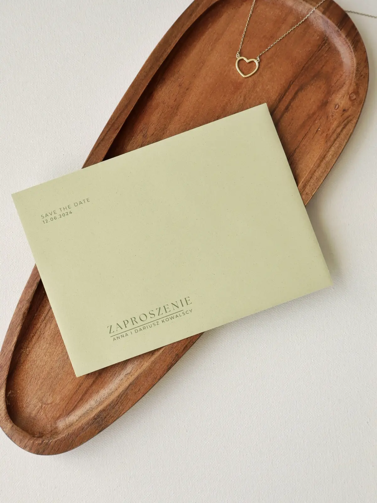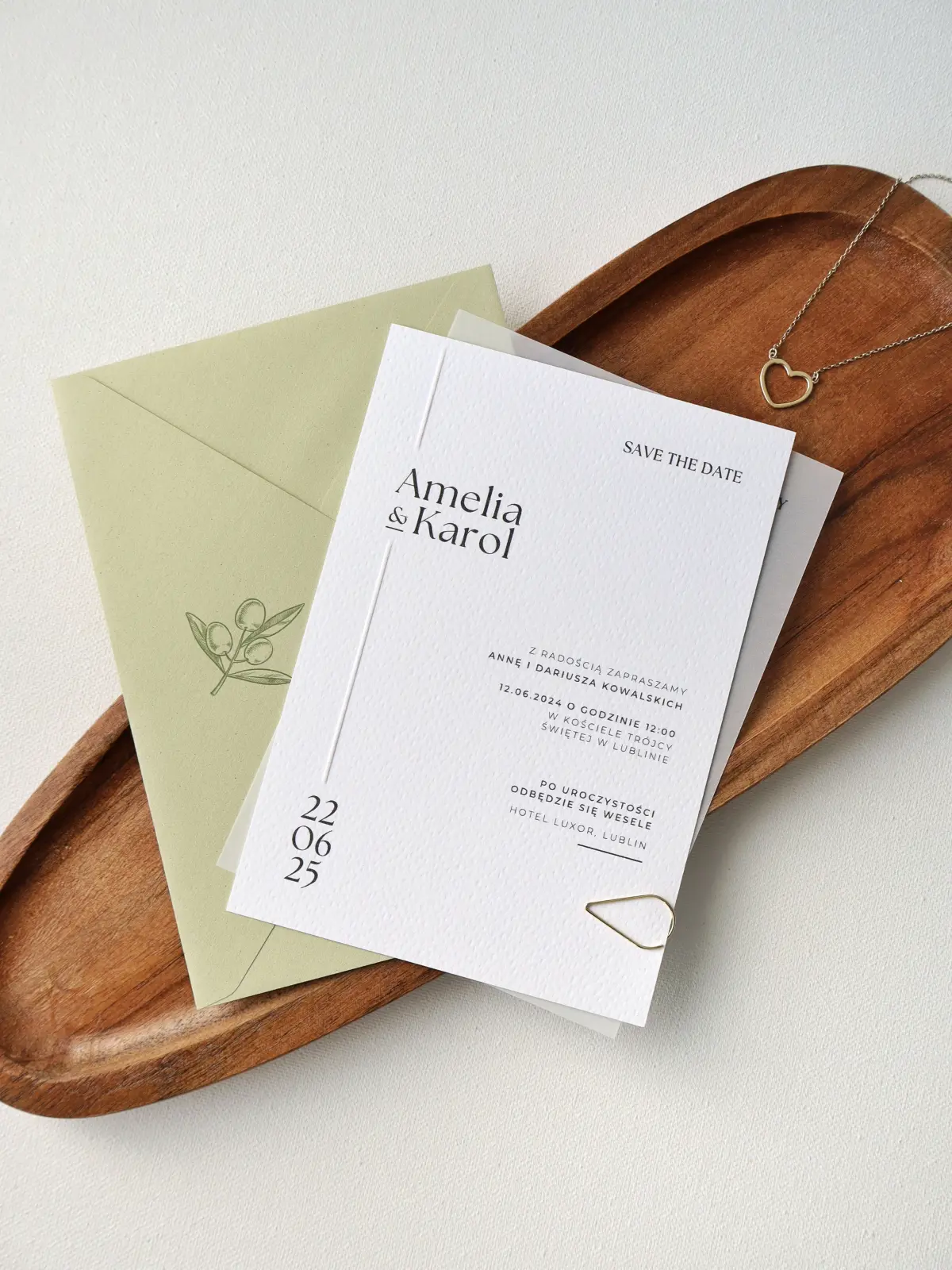 Zaproszenie ślubne na fakturowanym papierze z pionowym tłoczeniem i jasną oliwkową kopertą. W zestawie kartka RSVP oraz złoty spinacz. Dodatkowo koperta z nadrukiem na klapie i odwrocie oraz wklejka z oliwkowym motywem.