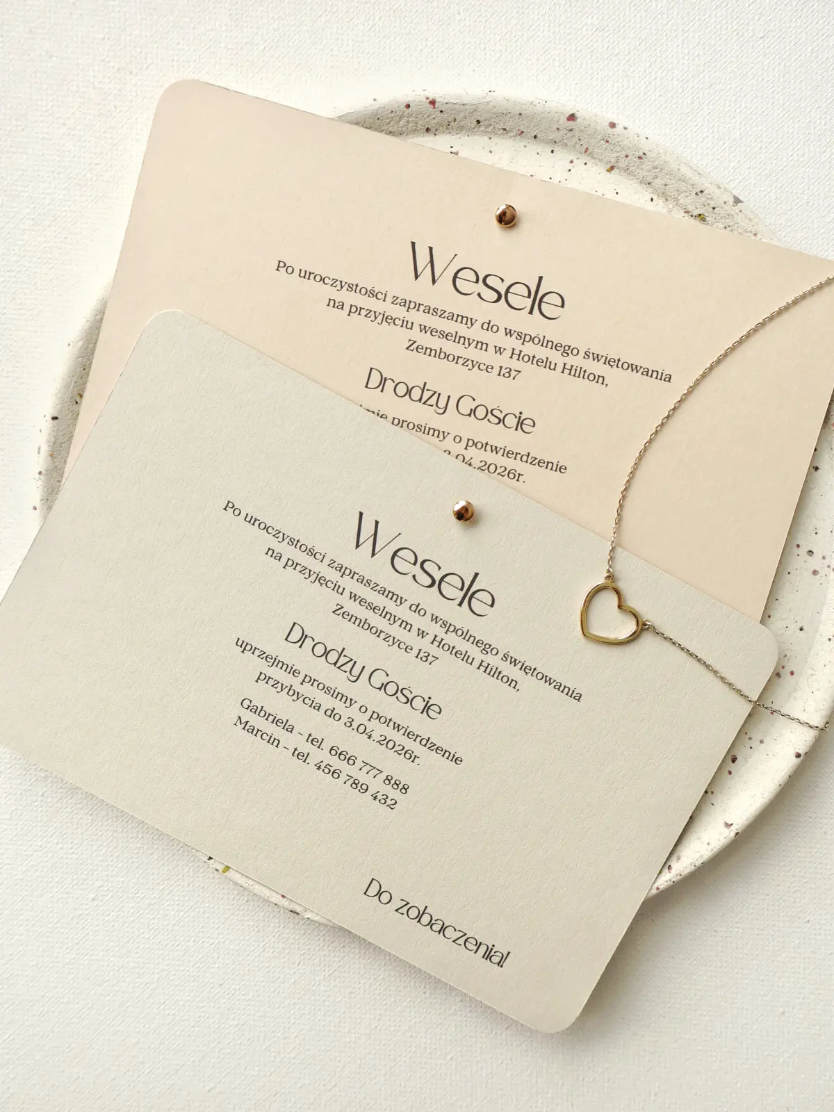 Zaproszenia ślubne są dostępne w dwóch wariantach kolorystycznych: biel z ciepłym beżem oraz biel z chłodnym beżem. Całość uzupełnia nietuzinkowa koperta z imionami Pary Młodej - subtelny detal, który porządkuje formę i podkreśla nowoczesny styl zaproszenia.