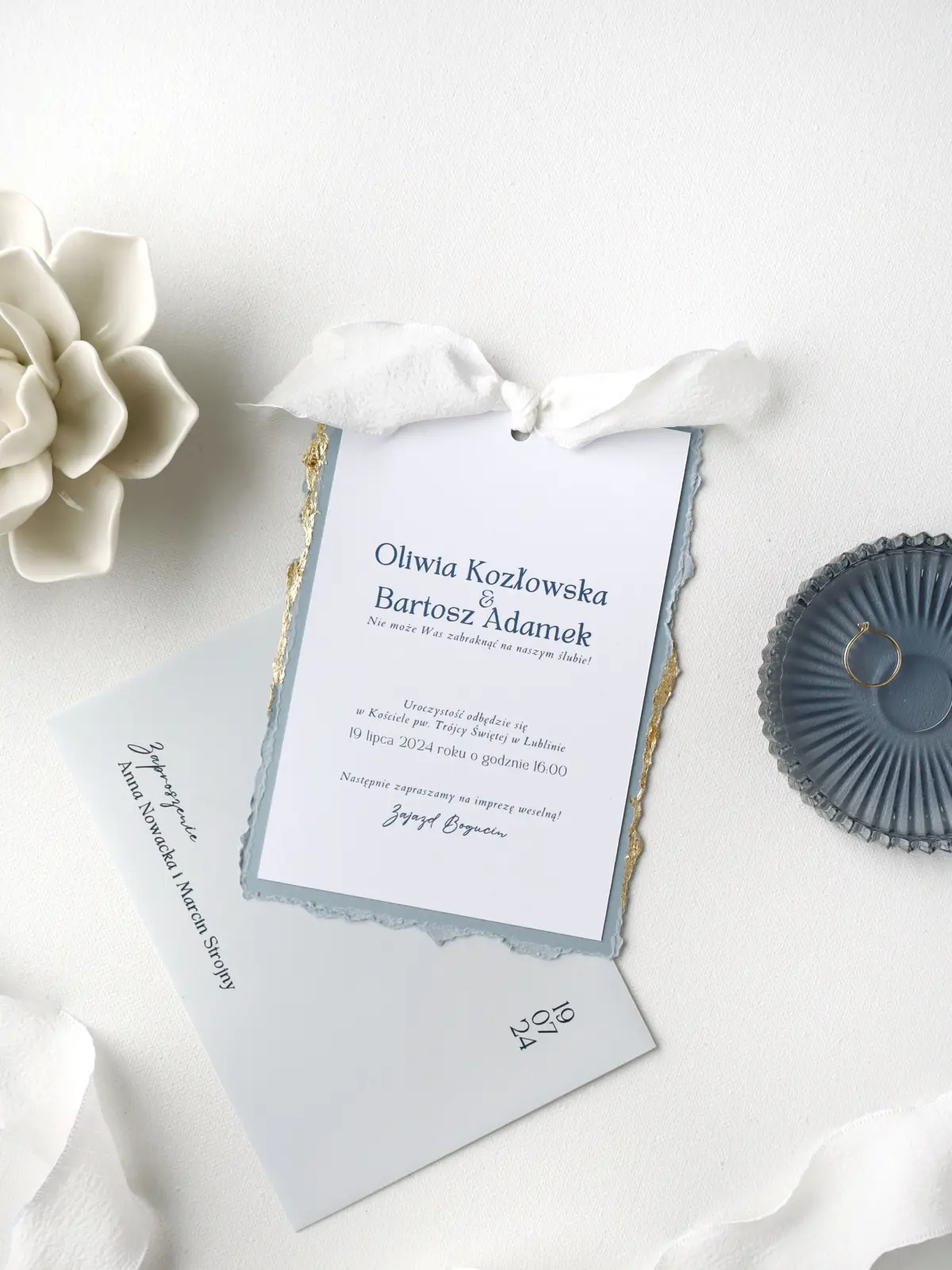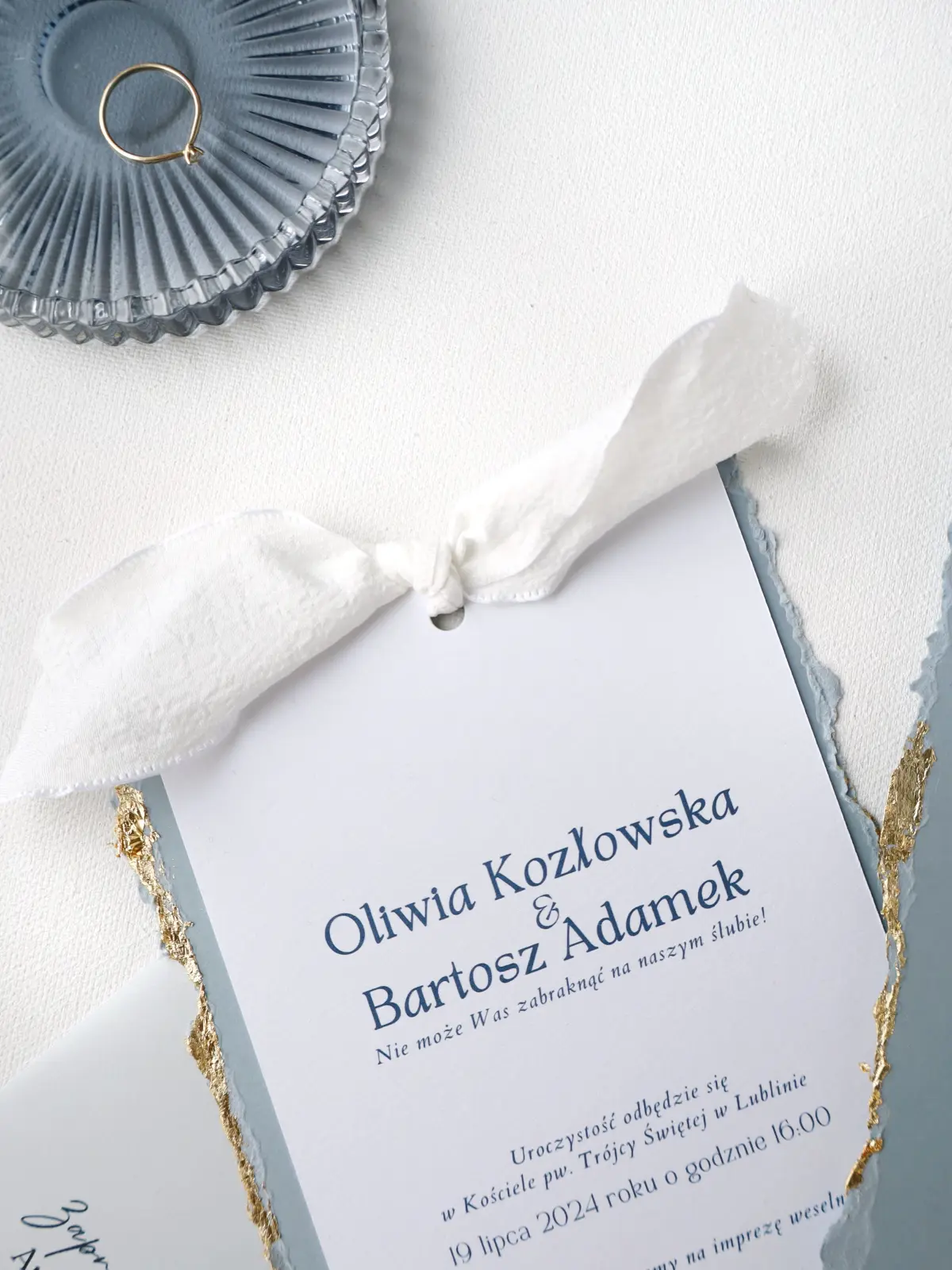 Biała karta zaproszenia i niebieska karta RSVP z postrzępionymi, złoconymi brzegami tworzą duet, który emanuje lekkością i finezją. Wszystko połączone delikatną, białą wstążką i spakowane w błękitno-szarą kopertę.