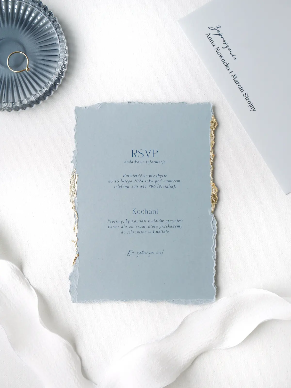 Karta z zaproszeniem w kolorze złamanej bieli, błękitne RSVP z postrzępionymi bokami i złoceniami, biała wstążka oraz koperta z nadrukiem.