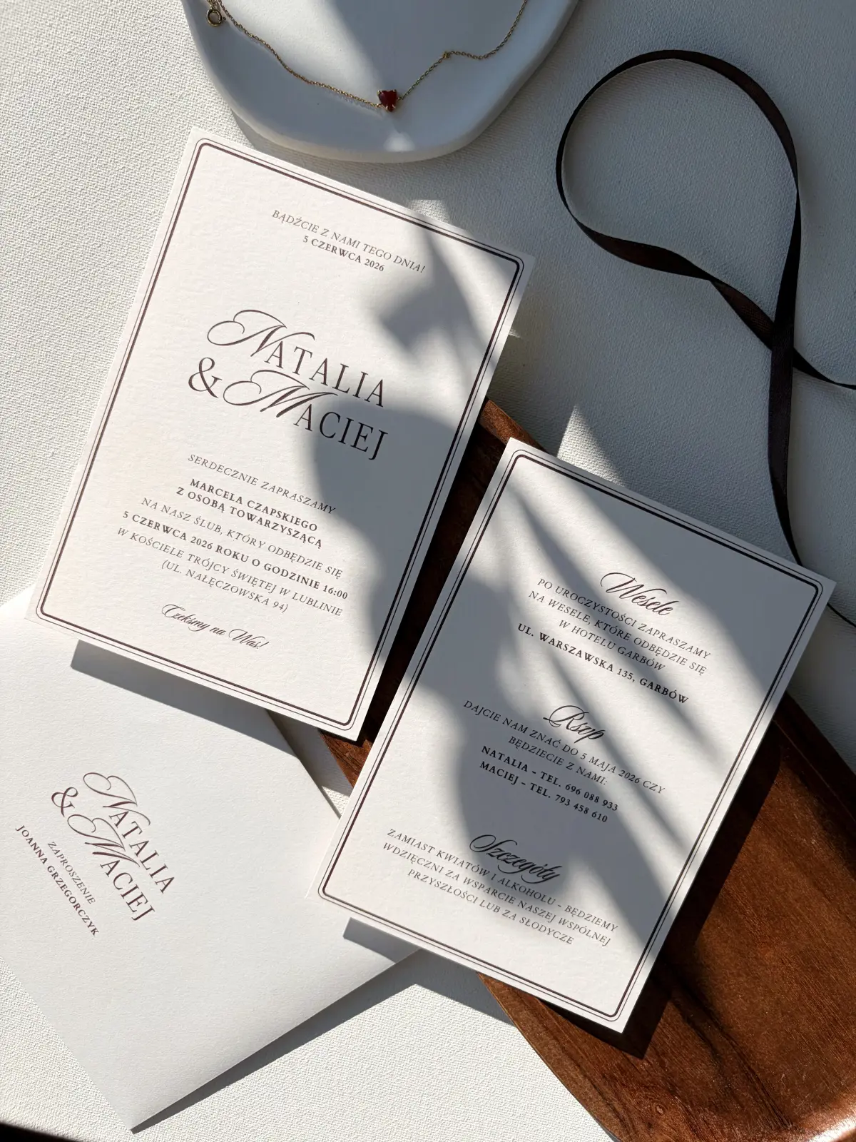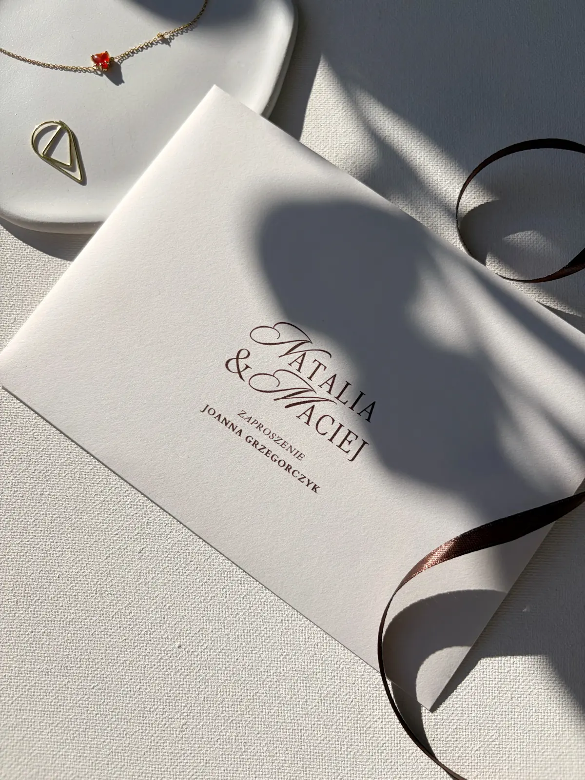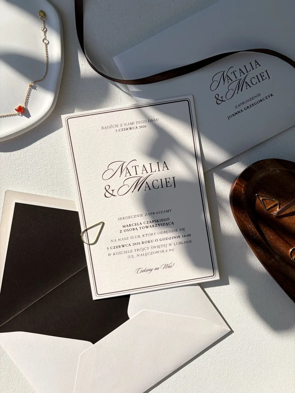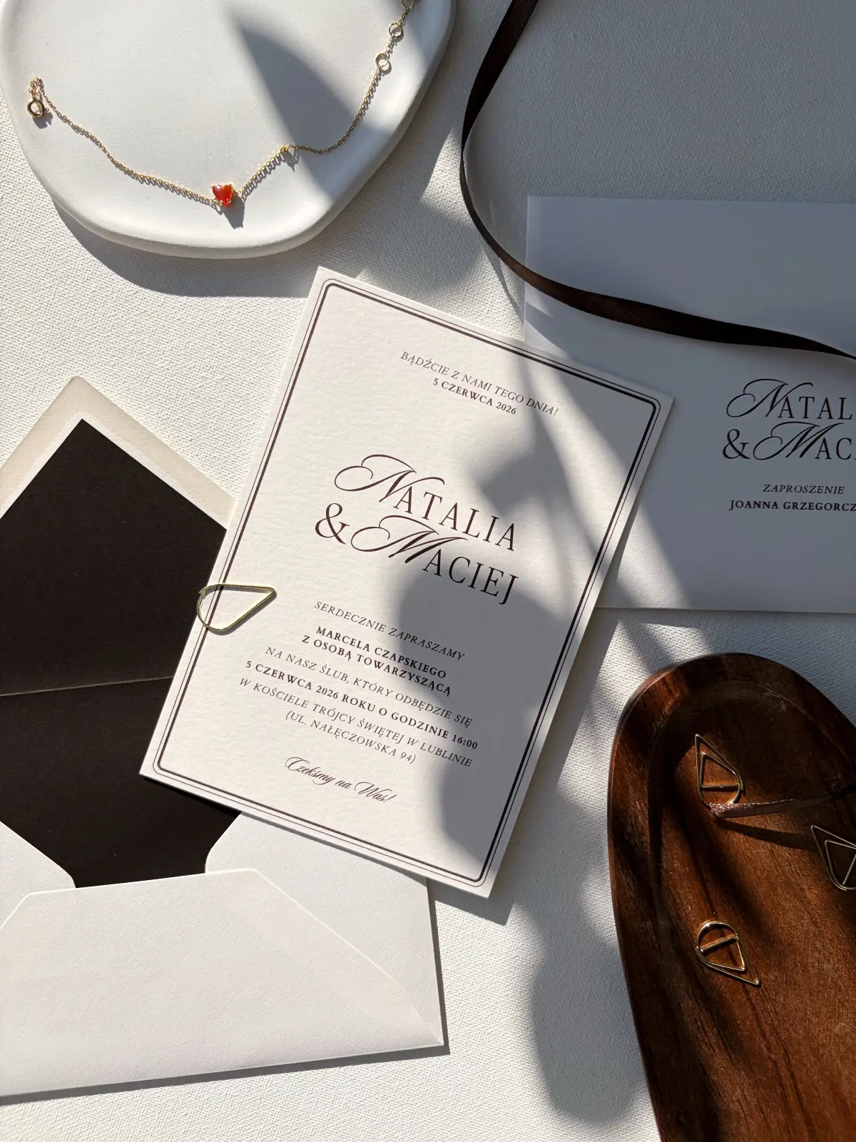 Biała karta z delikatną ramką tworzy minimalistyczną, ale niezwykle elegancką kompozycję. Ozdobne liternictwo imion nadaje zaproszeniu wyjątkowego charakteru, a brązowy druk wprowadza nutę głębi i szlachetności. Całość dopełnia dopasowana koperta z brązową wklejką, nadającą kontrastu i harmonii zaproszeniu.