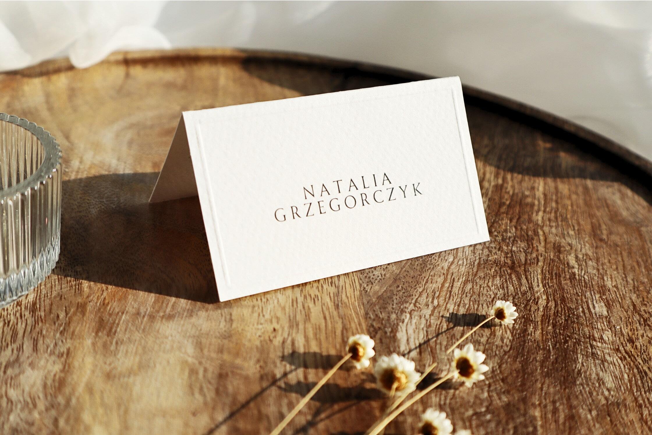 Winietka weselna stojąca z ręcznie tłoczoną ramką. Winietki z tej kolekcji drukujemy na fakturowanym papierze premium o gramaturze 300g w odcieniu delikatnej śmietanki o wymiarach 90x50mm (przód z imieniem i nazwiskiem gościa).