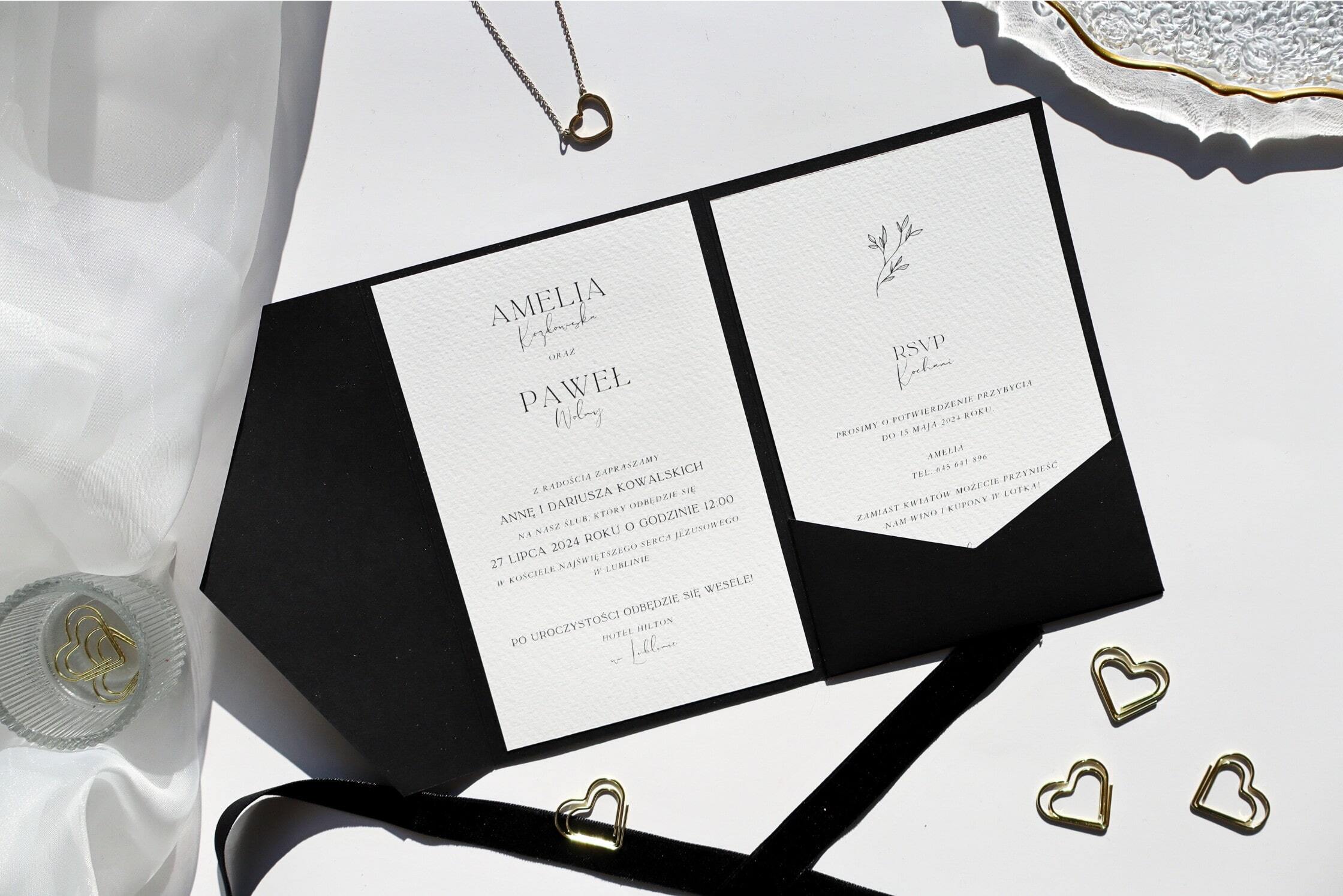 W zestawie do każdego zaproszenia dodajemy złoty spinacz w kształcie serca. Oferujemy też wariant z dodatkową kopertą w odcieniach delikatnego beżu.