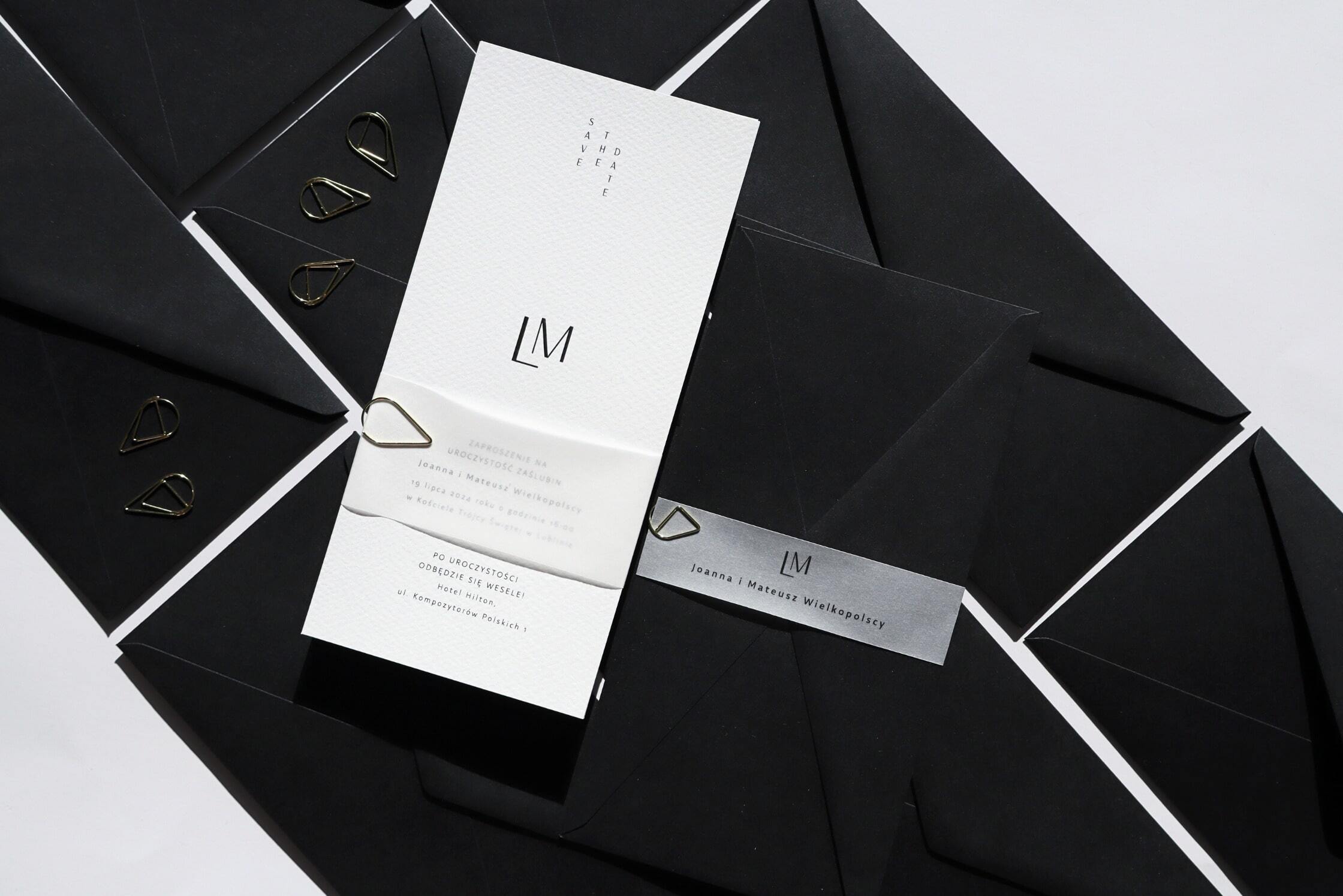 W zestawie do każdego zaproszenia istnieje możliwość dokupienia czarnej koperty, obwoluty na kopertę z danymi gości i inicjałami Pary Młodej oraz złotego spinacza.