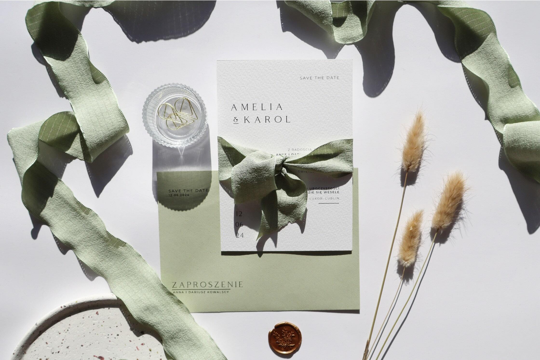 Zaproszenie oraz karta RSVP zostały wykonane na wysokiej jakości papierze fakturowanym o gramaturze 300g w odcieniu delikatnej śmietanki. Obydwie kartki są w rozmiarze 115x165mm. Design uzupełnia pistacjowa wstążka.