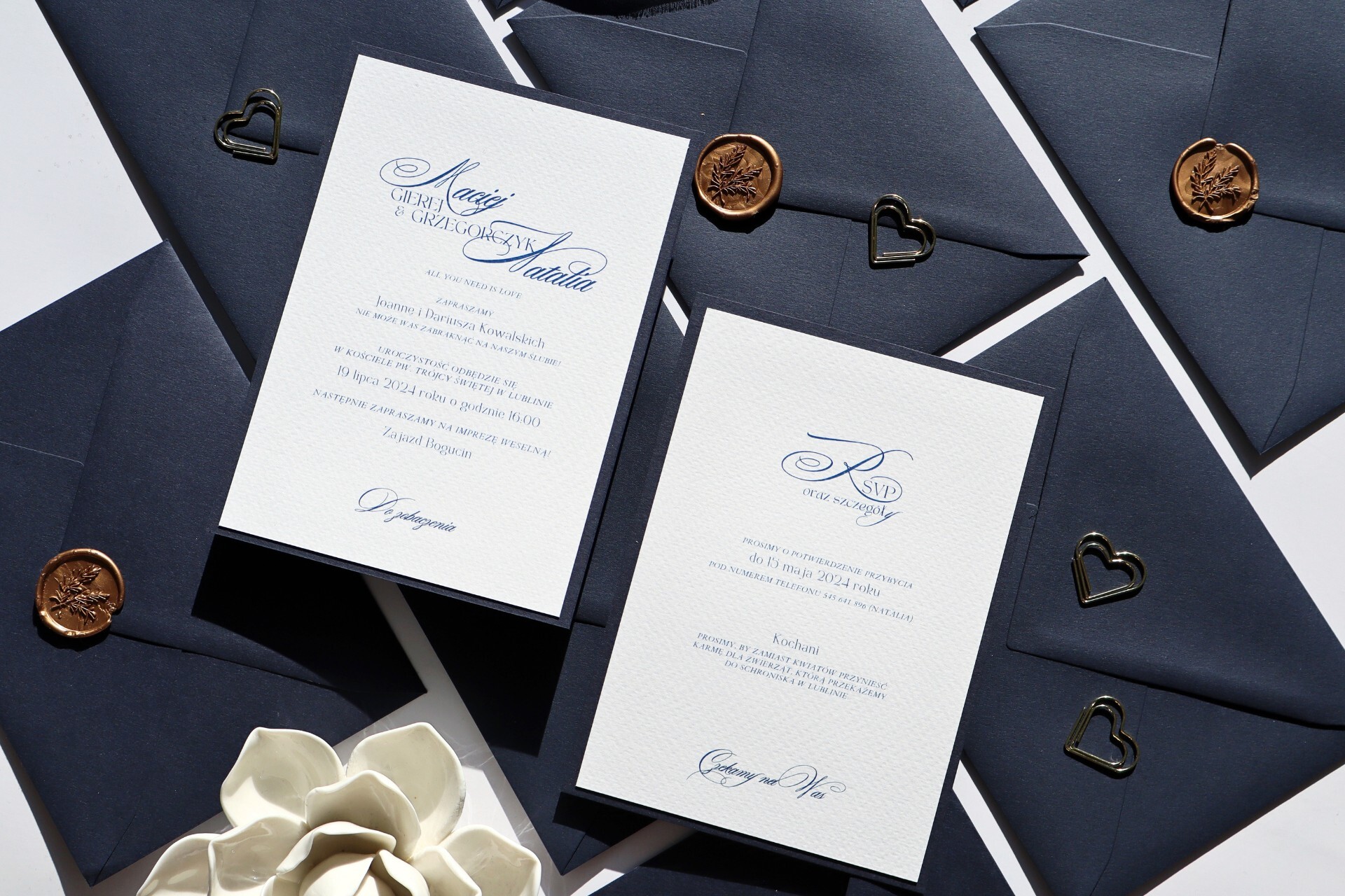Zaproszenie oraz kartka RSVP zostały wykonane na wysokiej jakości papierze fakturowanym o gramaturze 300g w odcieniu delikatnej śmietanki. Rozmiar obydwu kartek: 115x165mm. Plecki kartek są podklejone wysokiej jakości granatowym papierem. W zestawie znajdują się dwie kartki tworzące elegancką całość.